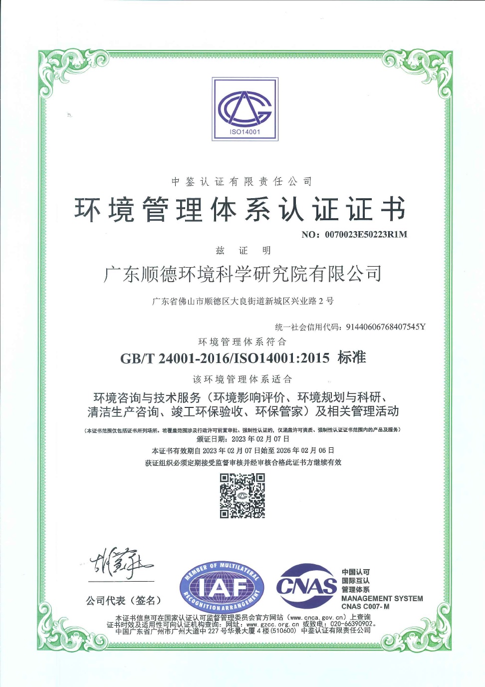 證書編號:粵環監證第2017003號